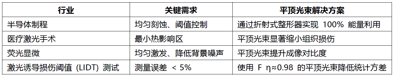 重點(diǎn):在需要滿足特定閾值(如激光加工、非線性頻率轉(zhuǎn)換)的應(yīng)用中,平頂光束能顯著提升工藝收率。